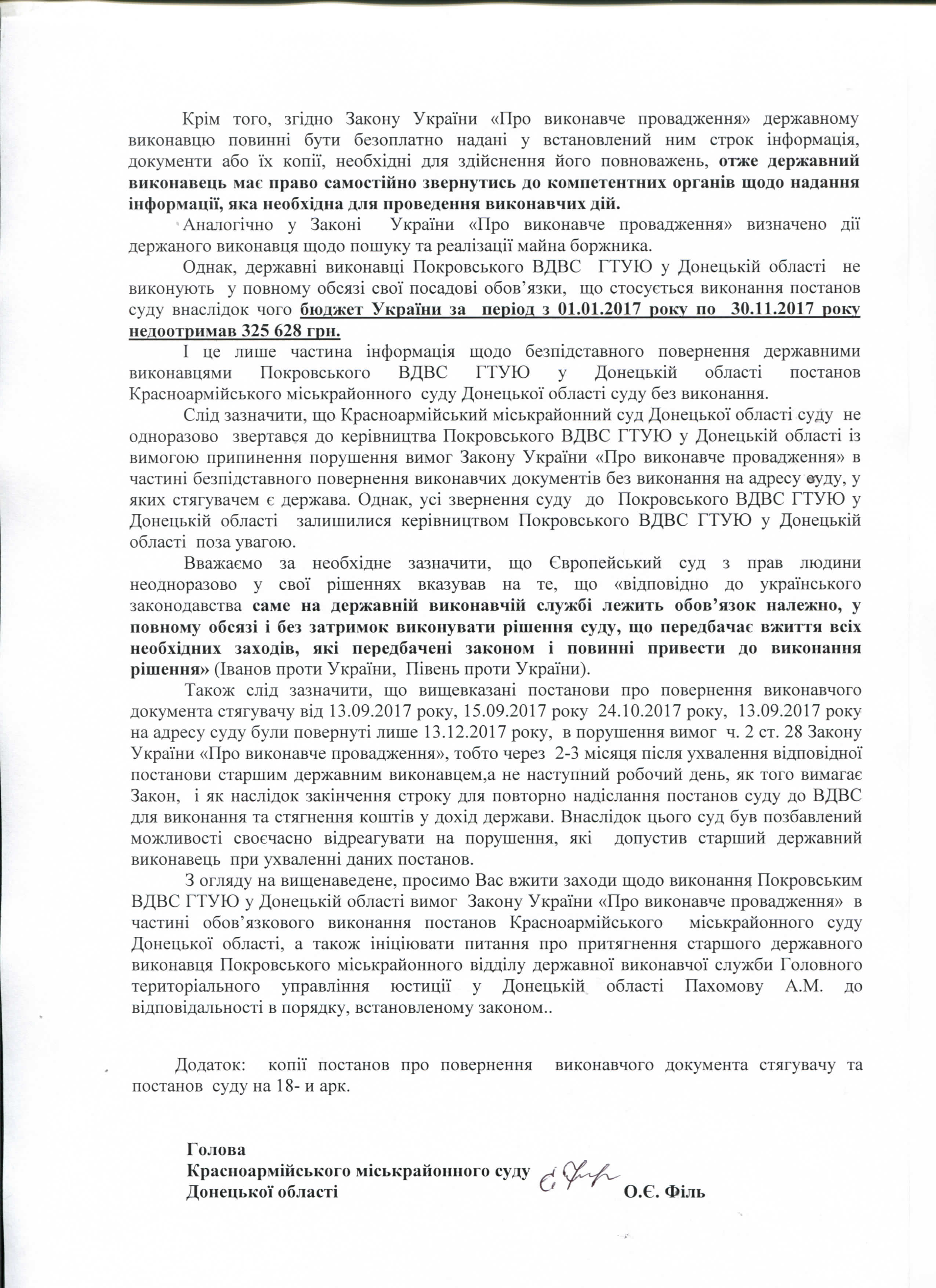 Внаслідок не виконання Покровським ВДВС постанов суду в частині стягнення судового збору та штрафів, бюджет України втратив кошти у розмірі 325 628,00 грн.