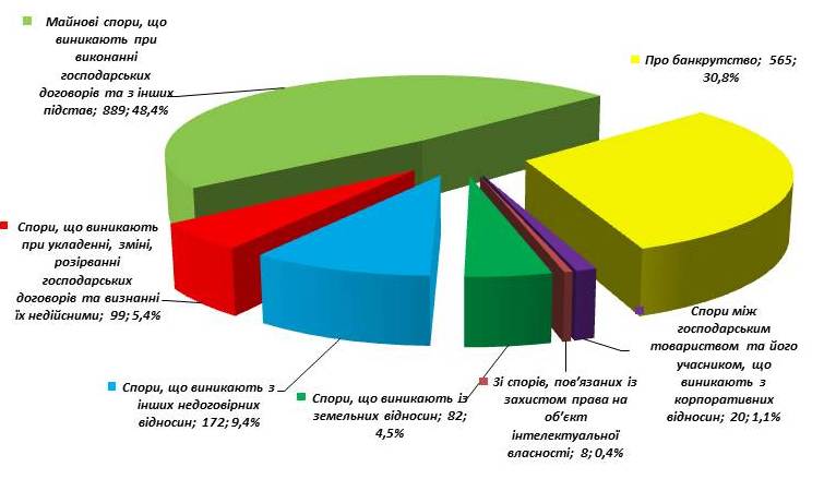У структурі вирішених спорів найбільш численні є справи у спорах про укладення, зміну, розірвання, виконання договорів (правочинів) та визнанні їх недійсними, що становить 50,6% від загальної кількості розглянутих справ та заяв.