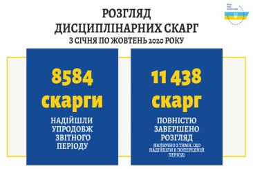 Протягом січня – жовтня 2020 року до Вищої ради правосуддя надійшло 8584 скарги щодо дисциплінарного проступку судді (за аналогічний період 2019 року – 8106 скарги).